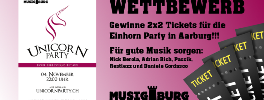 Die Party findet statt am Freitag, 4. November, ab 22 Uhr. Wo: In der Musigburg Aarburg (ehem. Moonwalker). Das Lokal befindet sich direkt beim Bahnhof Aarburg-Oftringen. Der Event ist ab 16 Jahren. Ab 30 Jahren ist der Eintritt kostenlos. Radio Smash verlost 2×2 Tickets für die Party. Was musst du dafür tun? Nenne den Namen deiner Begleitperson als Kommentar. Mit etwas Glück bist du am Freitag gratis mit dabei wenn es heisst: Das Einhorn lebt! Für alle welche an der Verlosung kein Glück haben gibt es Tickets auf Starticket.ch oder an der Abendkasse zu erwerben. Die Gewinner des Wettbewerbes werden spätestens am Freitagnachmittag bekannt gegeben.