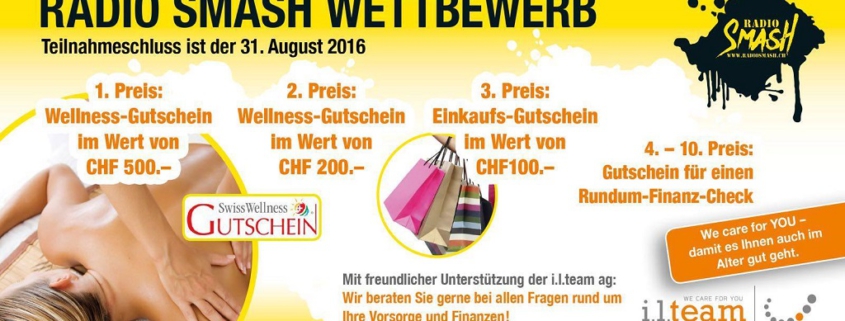 Zum ersten Mal lassen sich mit Radio Smash an der Kilbi auch fette Preise abstauben: Der grosse i.l.team-Wettbewerb winkt mit einem Wellness-Gutschein im Wert von 500 Franken sowie weiteren grosszügigen Gewinnen. Ein Besuch des Radio-Smash-Standes lohnt sich also aus allen möglichen Gründen. Zu finden ist der Radio-Smash-Stand dieses Jahr in der Schützi Olten.